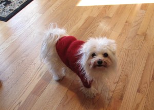 Woweeee, it’s cold out this morning. I should have worn my gloves when I walked Rockamino (one of his many nicknames). After 10 years in Southern California, I am still kind of surprised when the cold weather blows in. Will have to get Rocky’s red sweater out soon, which he hates. Here’s a photo of him in it…
