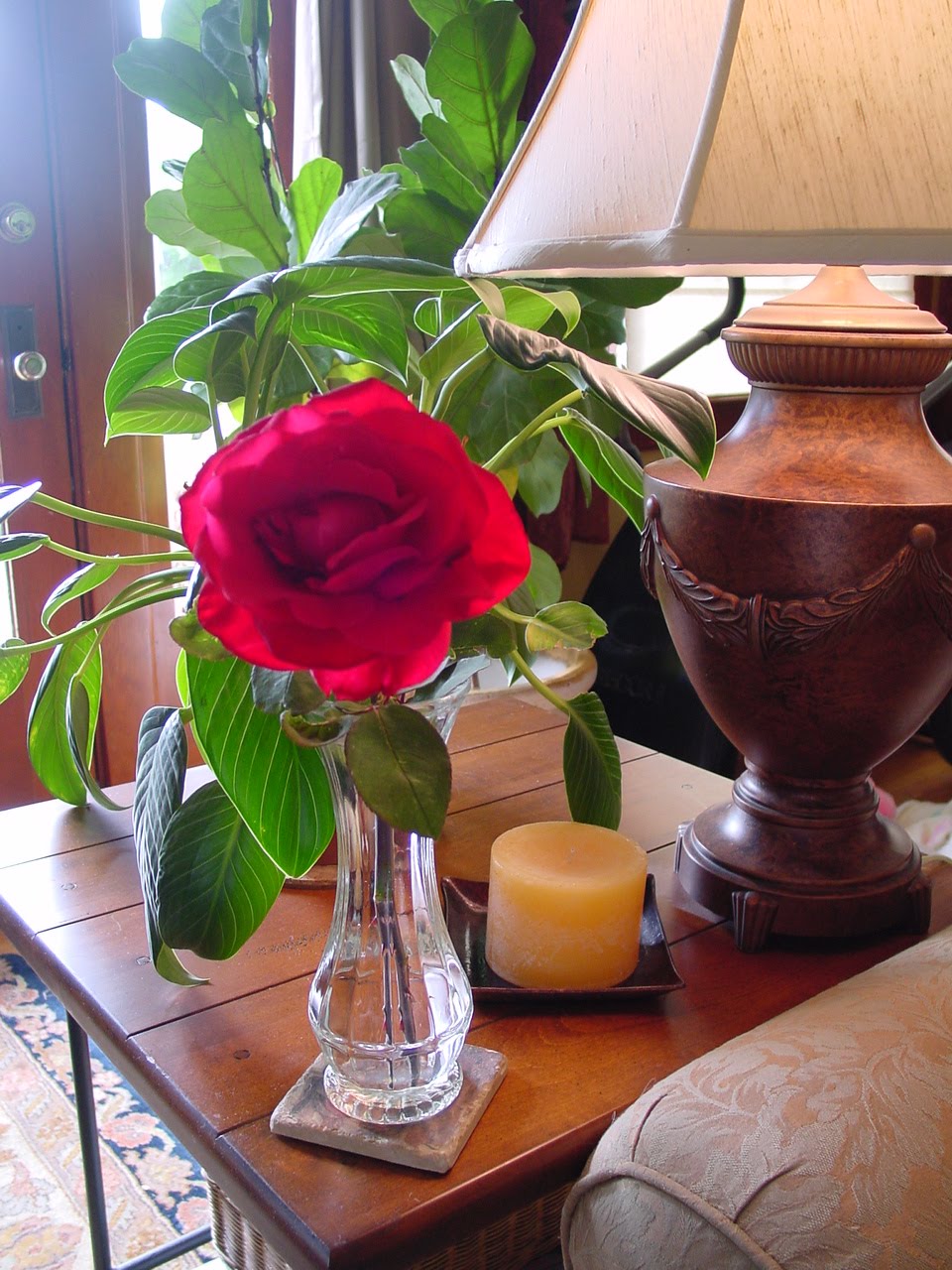 This belle rose was growing outside the little cottage I rented for a year in California. Unfortunately, I was just learning my way around a new camera and the rose is a bit out of focus. But doesn’t it look nice with my lamp and plants? I loved that little cottage.
