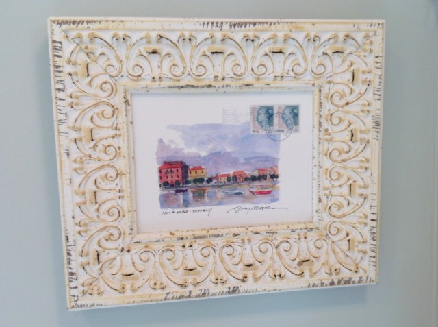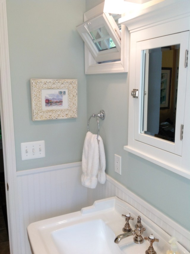 Our contractor managed to squeeze a tiny casement window on the other side of the mirror, so the outside of the house wouldn’t look weird with a big window on just one side. The framed print is an Italian “postcard” I bought in California.