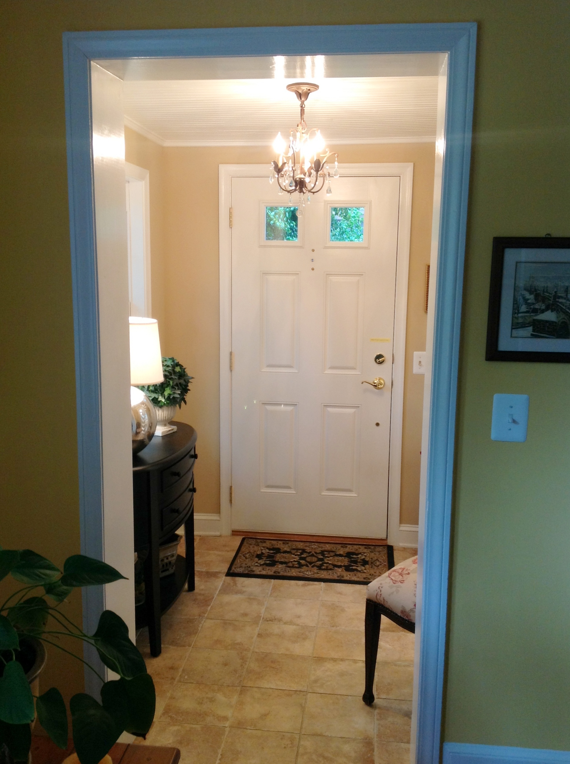 It is soooo nice to have a powder room on the main floor. At first, I thought my husband was kidding when he said we had to go upstairs or downstairs. After some discussion, we decided to convert the front porch into a foyer and powder room. Here are a couple of shots of the new foyer: