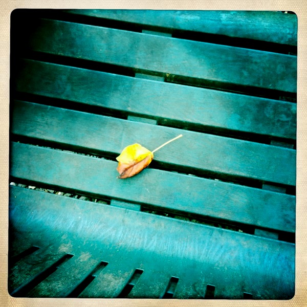 Now that the leaves are starting to turn, I’m getting a little obsessed with photographing them. Every year, I’m amazed at how colorful and beautiful they are. I shot this with my iPhone, using Hipstamatic John S lens, Ina’s 1969 film; flash off. It wasn’t until I uploaded the photo that I noticed the worn area on the bench around the leaf was heart-shaped. Kind of like l’heure bleue.