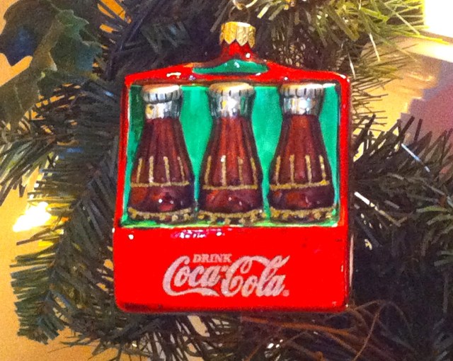 I love this handpainted Coca-Cola ornament. It’s not an expensive Christopher Radko, but nice just the same. We don’t have a tree up yet, so I affixed it to a garland on the mantel.