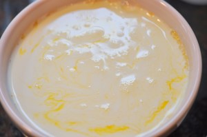 This is the only mixing photo I have. I thought the eggs and cream looked pretty in the pink bowl.
