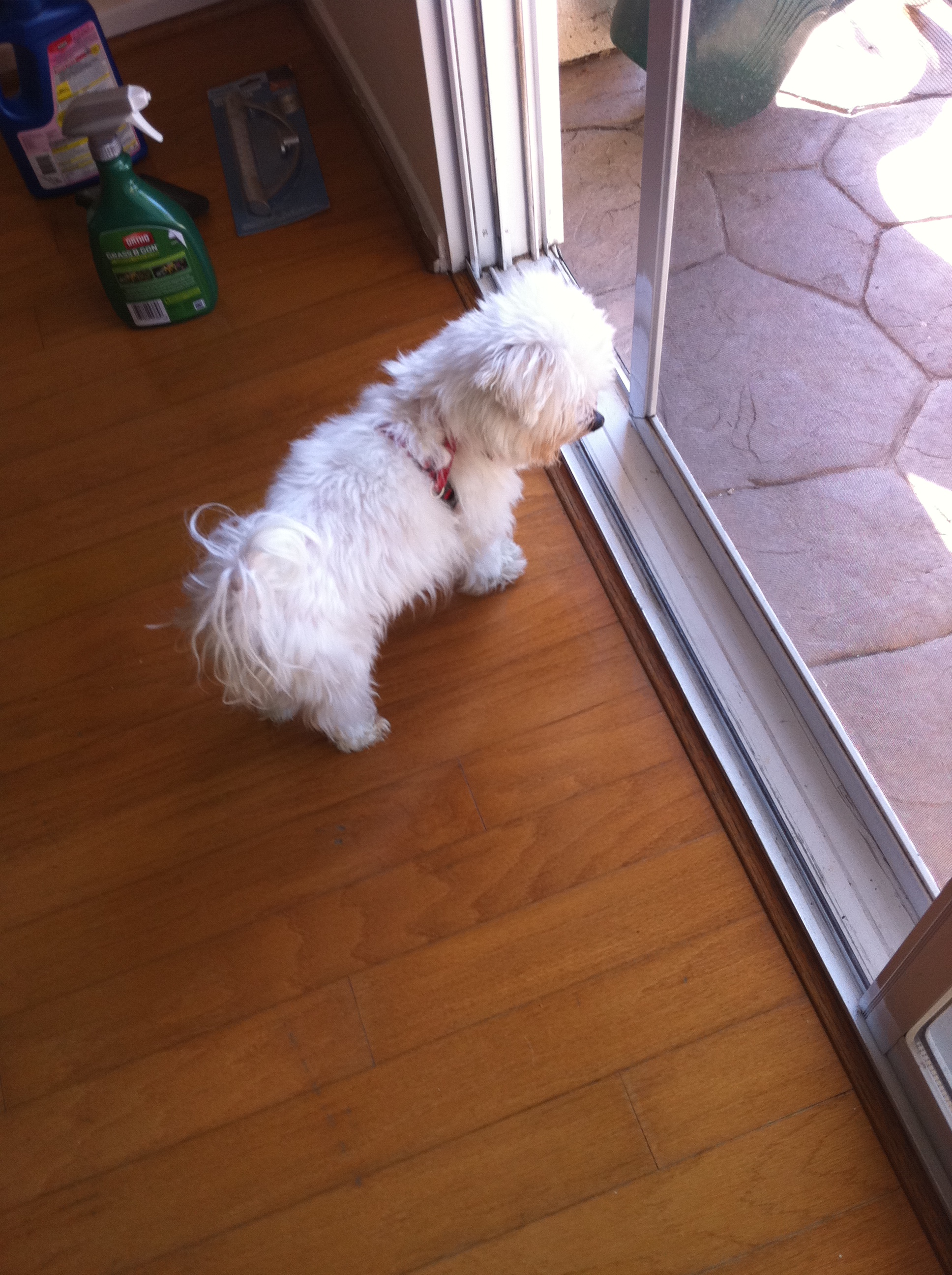 Six years ago, we lived in a house with sliding glass doors that led to the patio. There was also a sliding screen door to let in fresh air. The screen door squeaked slightly when we moved it, and Rocky seemed to think a mouse or some other animal lived inside. He would run to the door and stand there waiting for “Mousie” (our name) to come out. He would have stayed there all day if we’d let him.