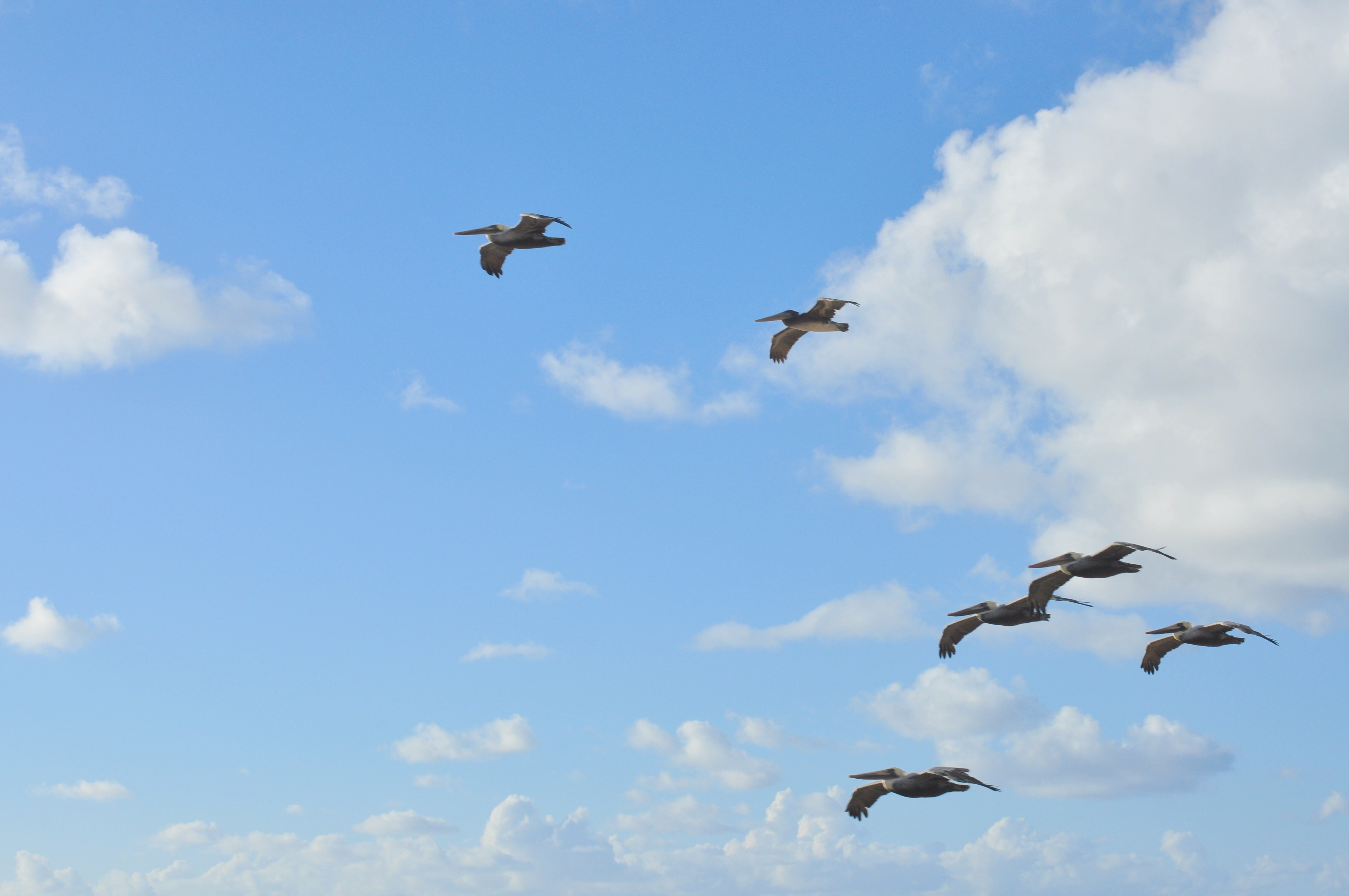 • I agree that they look like pelicans. I’ve seen similar-looking birds in Florida and the Caribbean. Their beaks expand into large pouches on the bottom to hold lots and lots of fish! They scan the water for shadows of fish and then swoop right down and pluck the fish out of the water. Very impressive as I saw it close up while I was snorkeling.
