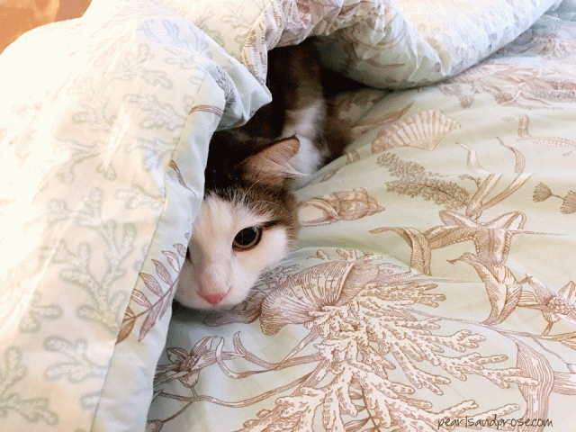 Yuri loves to hide and then jump out at me. His favorite thing is to leap from his cat tree onto the sofa when I’m walking by. He times it just right so he flies right across me. I can actually hear the air whistling as he flies through the air. We haven’t collided yet, which is pretty amazing since I’m moving at the time. The agility and timing of cats blows my mind.