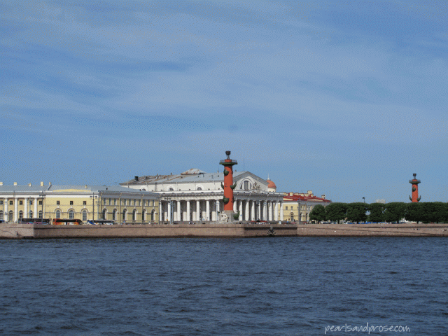 The terra cotta-colored structures are the Rostral Columns designed to hold beacons for what was once St. Petersburg’s main port, inspired by Roman victory monuments.