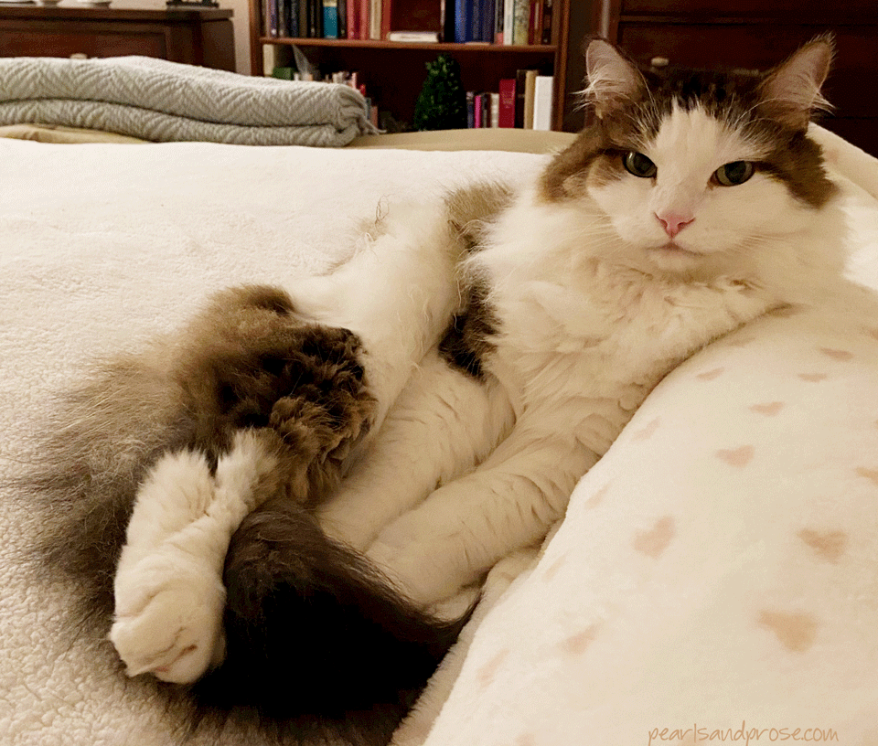 This photo of Yuri cracks me up because he looks like he’s posing, which never happens. And yes, he’s partial to my soft throw with hearts on it. 🙂
