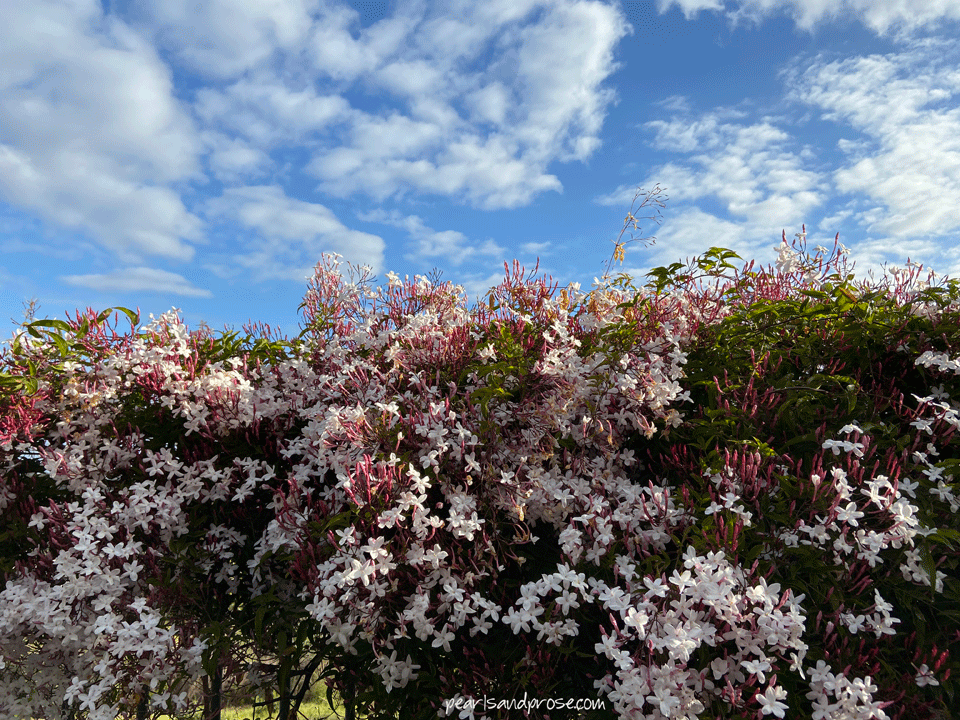 Two years ago I planted one pink jasmine plant and this is what it looks like now. Everything grows so fast in California! Gardening out here is basically cutting things back. I love the fragrance, as it’s like the white jasmine that blooms later.