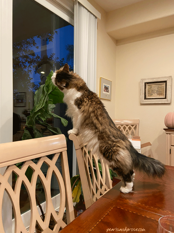 Here he is on the dining room table trying to eat a fig leaf.