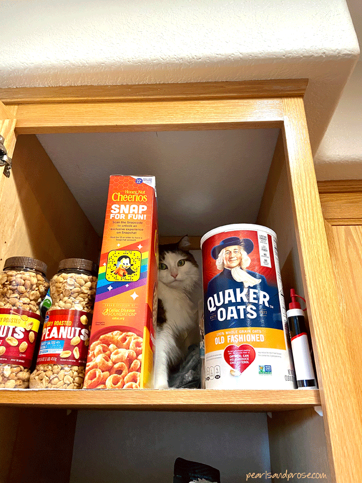I had turned my back for just a moment and he leapt up to the fridge and walked into the nearby pantry. How he squeezed between the Cheerios and Quaker oats, I’ll never know.