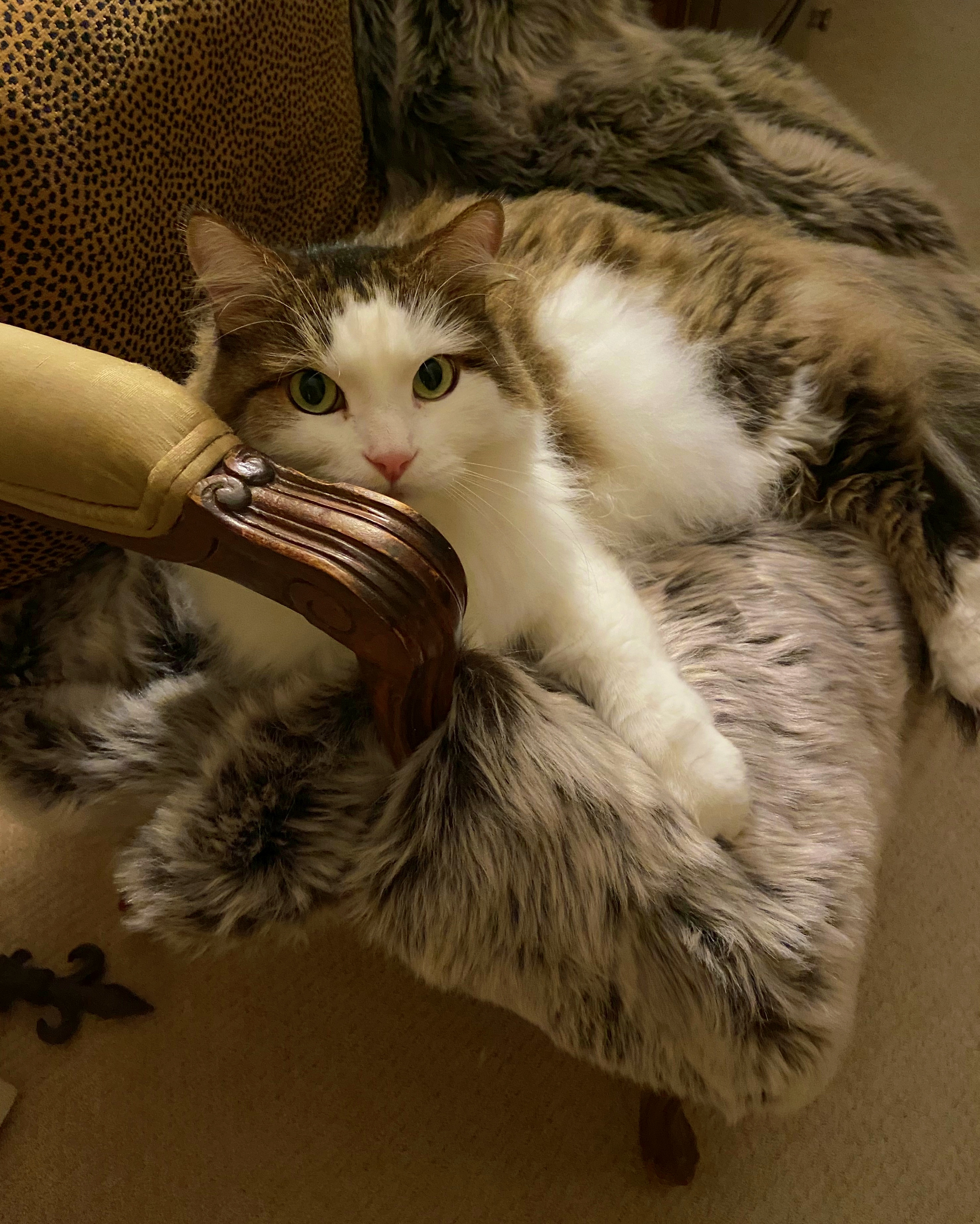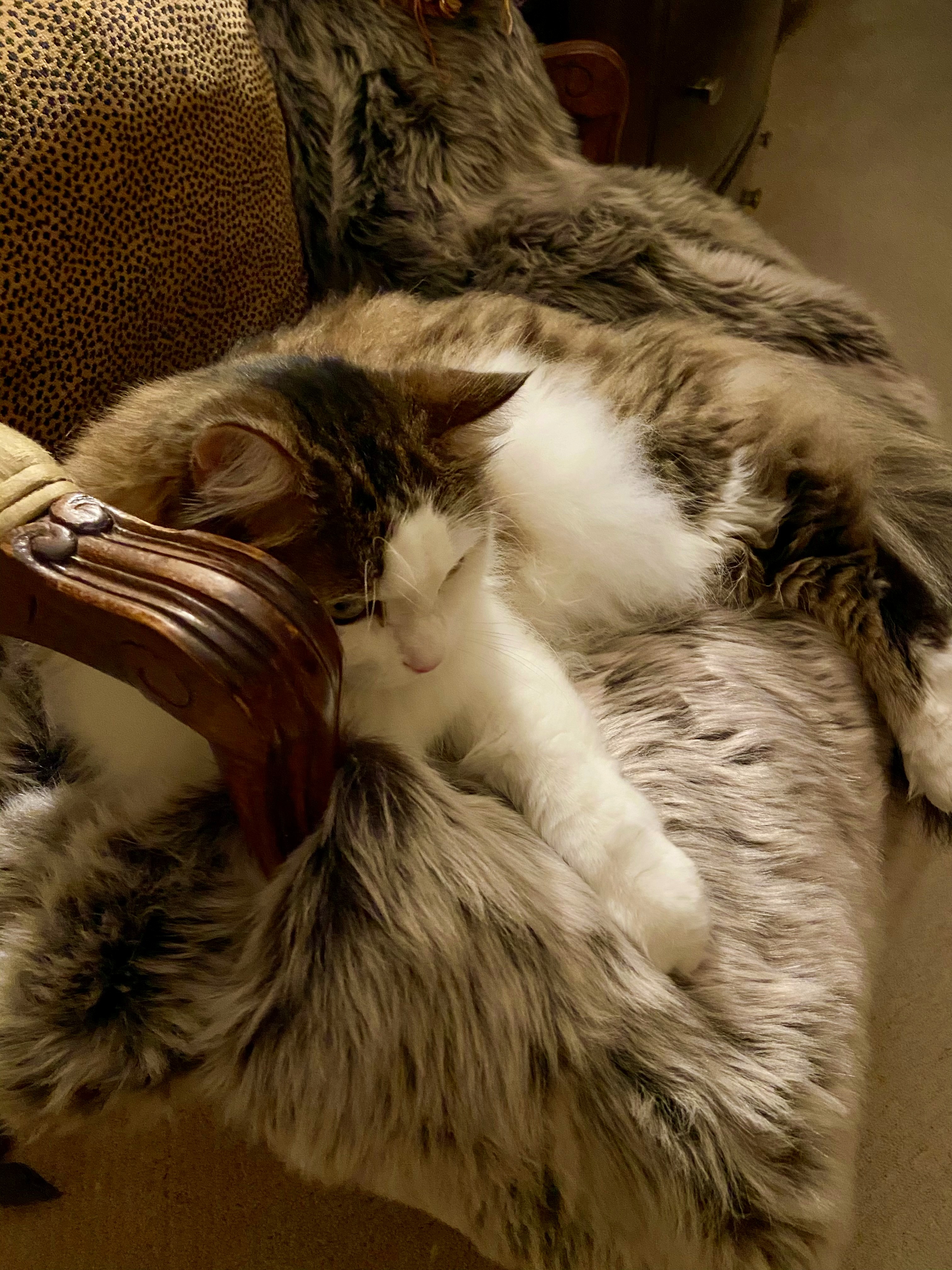 Our cat Yuri likes to sleep on a chair in our bedroom that has a fake-fur throw on it. It’s sometimes hard to see him there because he blends in so well!
