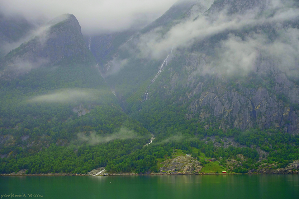 Just one photo today. I believe this is the Hardangerfjord area. Look closely and you’ll see tiny houses. I love the way the greenery is reflected in the water.