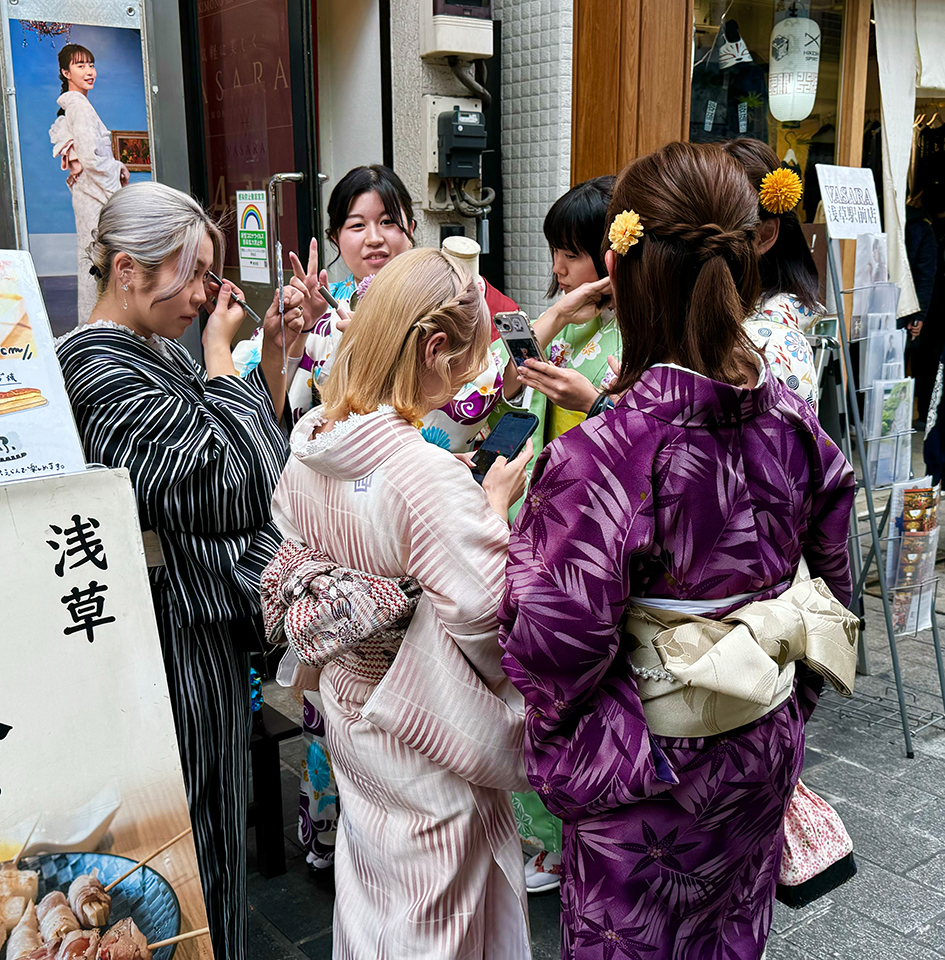 The teens experimenting with makeup and hair colors yet wearing traditional kimonos is is priceless. Love the fabrics!