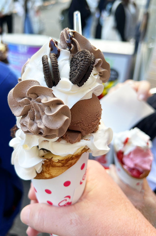 We got these incredible crèpe things in the Harajuku District of Tokyo. My son got the one with whipped cream, Oreos and chocolate ice cream. Mine is on the right. I got a strawberry shortcake crèpe. Not sure why my hand looks so dark. Needless to say, we skipped dinner that night.