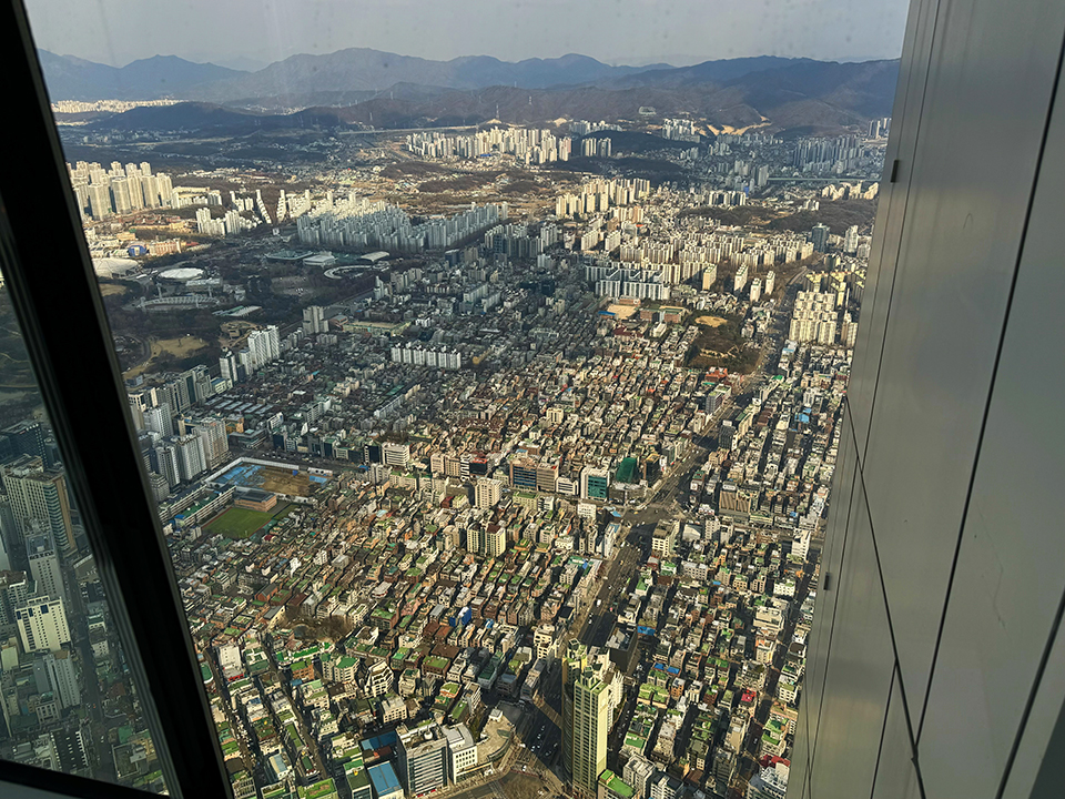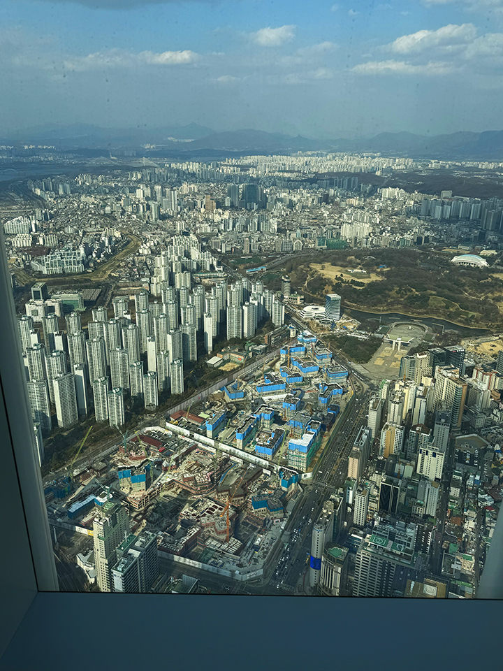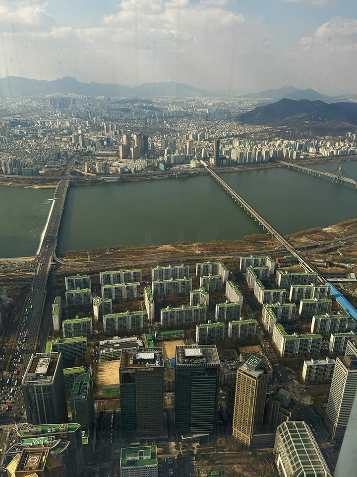 The views were pretty incredible. This is the Han River. I don’t know if the green stuff is Astroturf or what. Please excuse the streaks on the window.