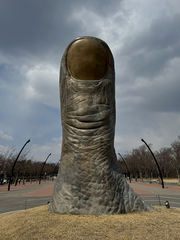 This is the giant thumb seen in the background of the photo above. French sculptor Cesar Baldaccini created it. This is one of the only seven large thumb statues existing in the world today. Another one is in La Défense area of Paris. It is 16.4 ft tall (5 meters).