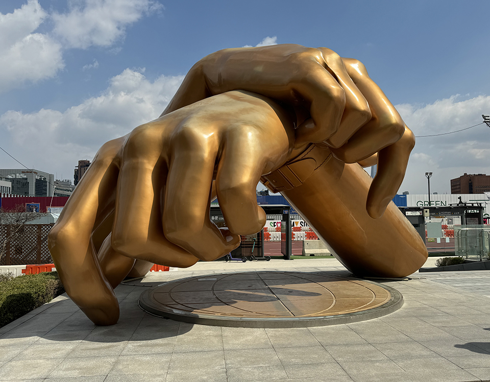 We then stumbled upon the “Gangnam Style” statue. “Gangnam Style” was a huge hit by PSY back in 2012. In the video PSY holds his hands like this.